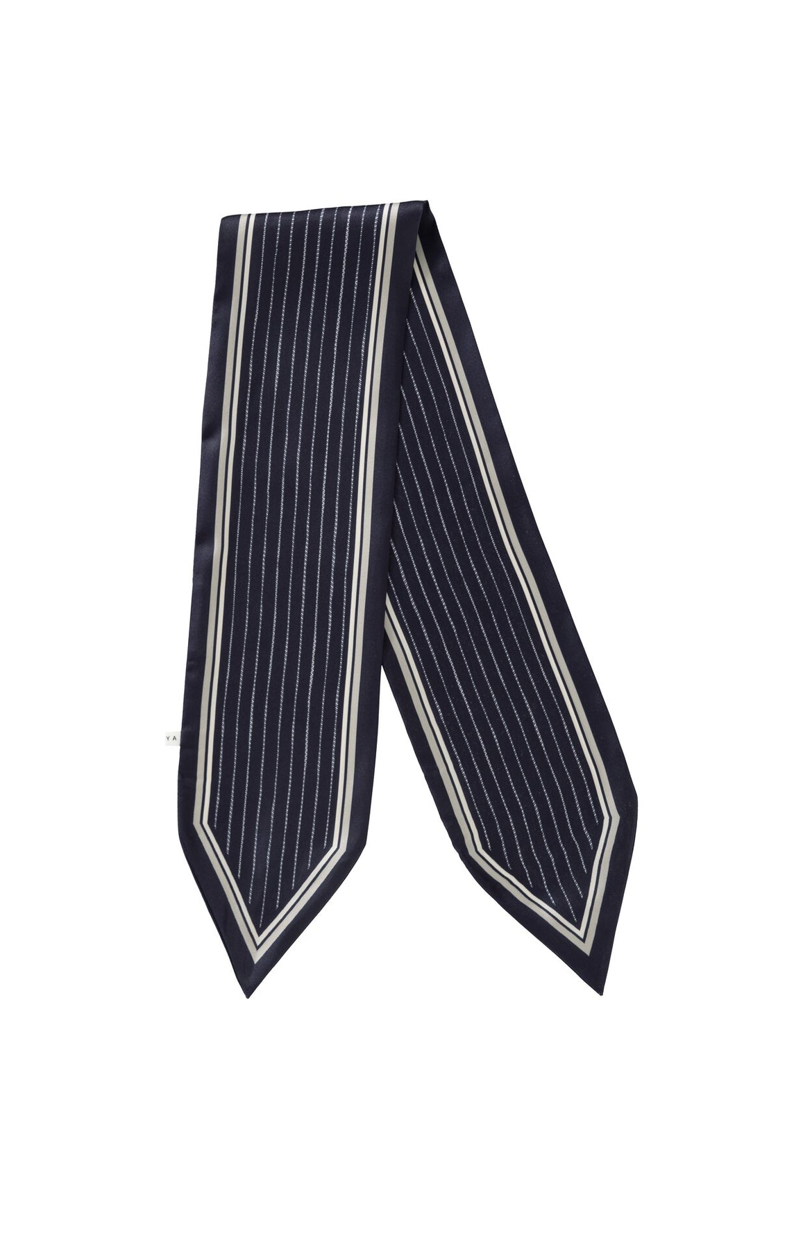 Dieser elegante Schal besteht aus fließendem Stoff mit einem dezenten glänzenden Finish. Er hat weiße Streifen auf tiefmarineblauem Hintergrund, eingefasst von einem kontrastierenden Rand. Dank der schmalen, länglichen Form kannst du den Schal ganz einfach um den Hals oder im Haar tragen oder an eine Tasche binden. Leicht und vielseitig.