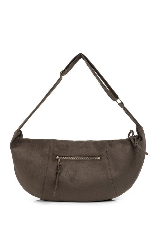 Diese weiche Umhängetasche aus Velourslederimitat besticht durch eine geschwungene Halbmondform. Sie hat einen Reißverschluss und ein zusätzliches Fach mit Reißverschluss auf der Vorderseite mit dekorativen Kordeldetails. Dank dem verstellbaren Schulterriemen lässt sich die Tasche individuell anpassen. Ein schickes Accessoire, das jedes Outfit aufwertet.