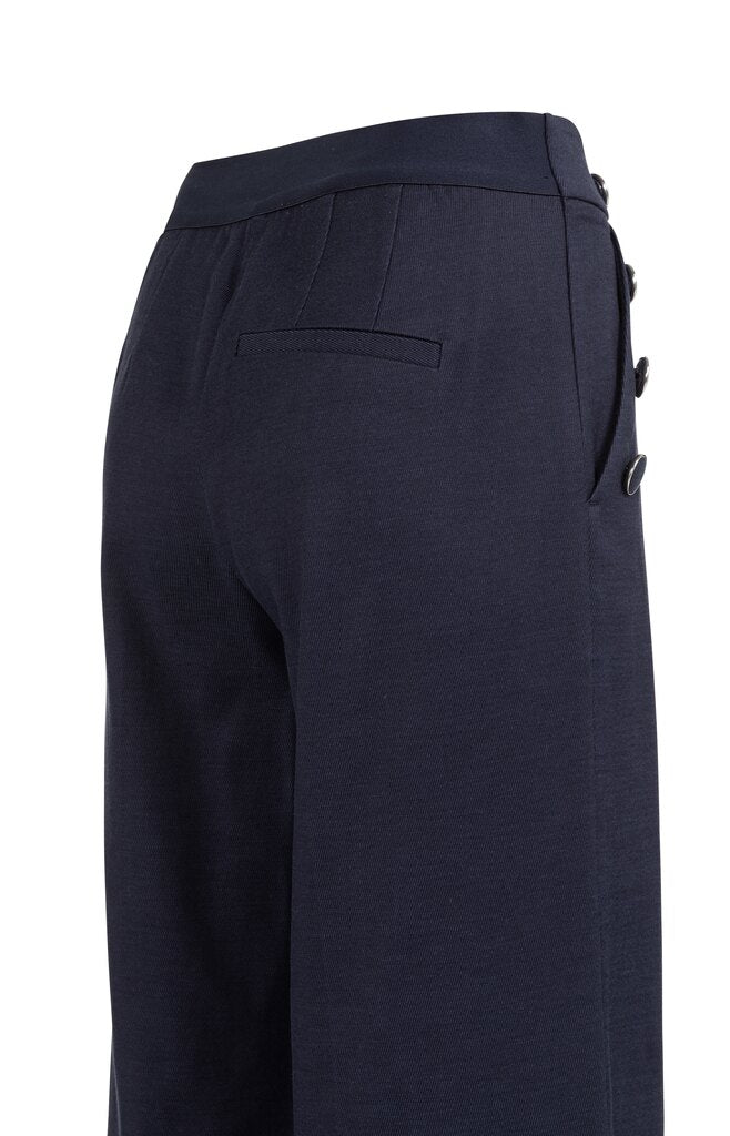 Diese stylishe Hose mit hohem Bund besteht aus weichem, fließendem Stoff und hat eine lockere Passform. Das weite Bein und die Zierknöpfe an der Seite verleihen ihr eine elegante Note. Der elastische Bund sorgt für zusätzlichen Tragekomfort, und die Paspeltaschen auf der Rückseite runden den Look ab.