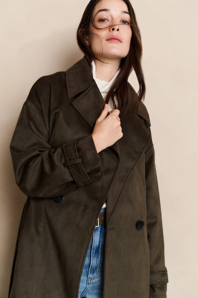Dieser elegante lange Mantel aus weichem Velourslederimitat hat eine Oversize-Passform, die für eine moderne Silhouette sorgt. Er besticht durch einen klassischen Reverskragen, einen Bindegürtel an der Taille und gerade Ärmel mit Bündchendetails. Der Mantel verfügt über Paspeltaschen und lässt sich mit einem Knopf verschließen. Er ist die perfekte Wahl für einen stylishen, bequemen Übergangslook. Das Model ist 175 cm groß und trägt Größe 2.