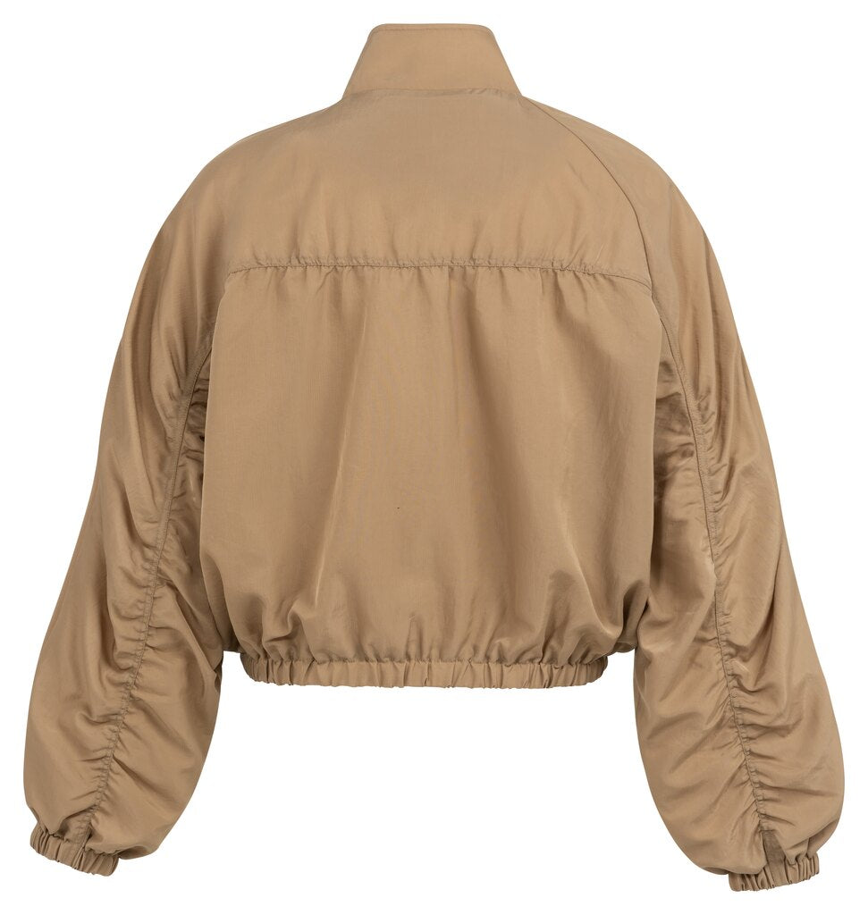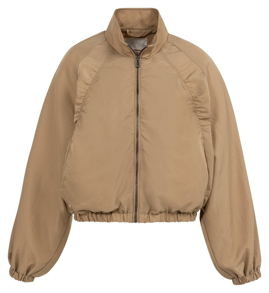 Diese kurze Jacke aus glattem, leichtem Stoff hat eine Oversize-Passform. Sie besticht durch einen Stehkragen, lange Ärmel mit Plisseedetails und einen Reißverschluss auf der Vorderseite. Die elastischen Bündchen und der elastische Saum verleihen ihr eine sportliche Note. Ein modernes, lässiges Kleidungsstück, das sich perfekt für die Übergangszeit eignet.