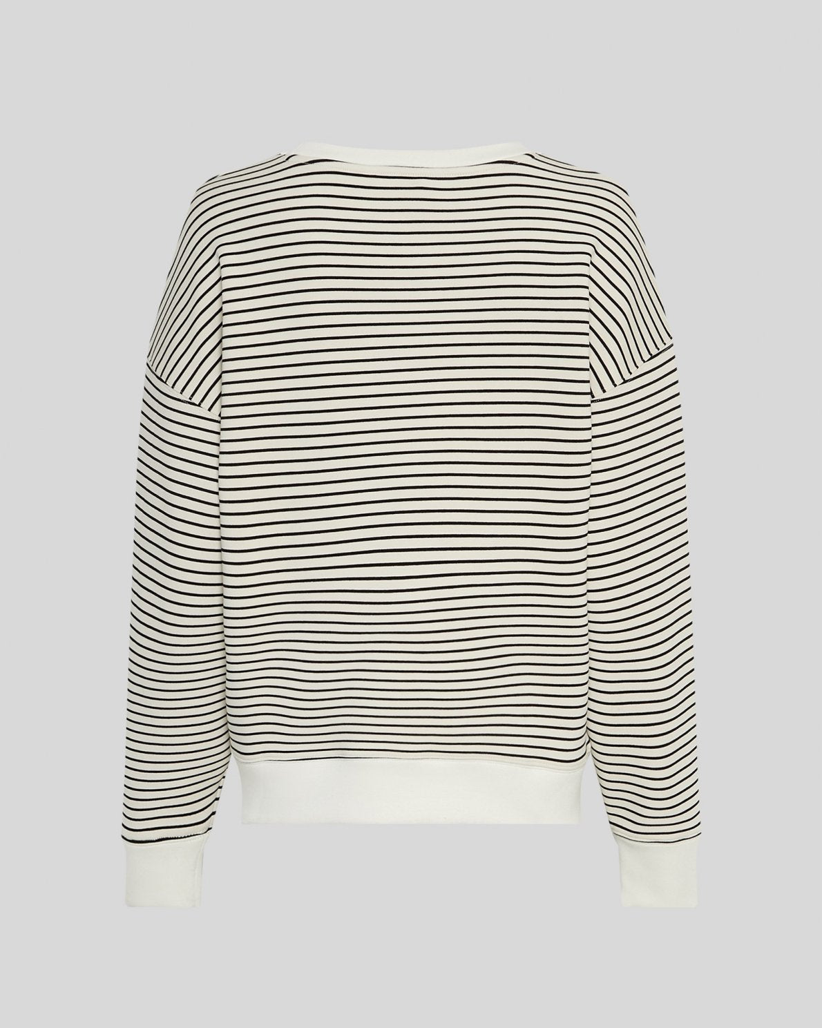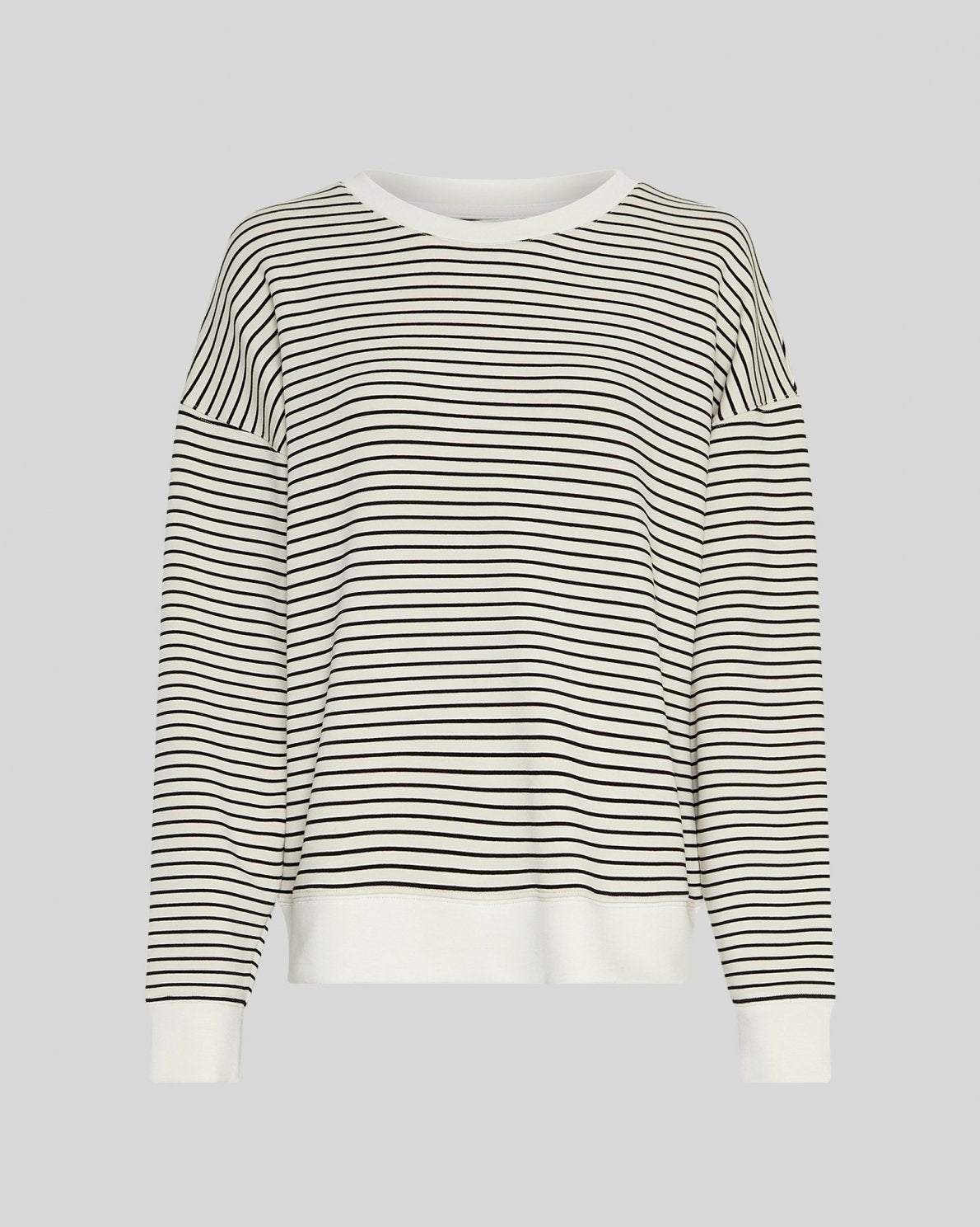Ein zeitloser Klassiker mit modernem Touch. Das Nilda Sweatshirt besticht durch weiche Streifen in Hafer- und Schwarztönen, überschnittene Schultern und eine entspannte Silhouette – entworfen für maximalen Alltagskomfort und müheloses Styling. Tragen Sie es zu Jeans, über ein Kleid oder kombinieren Sie es mit passender Loungewear für einen lässigen Off-Duty-Look.
