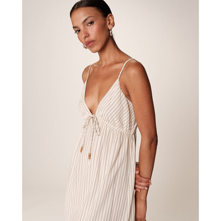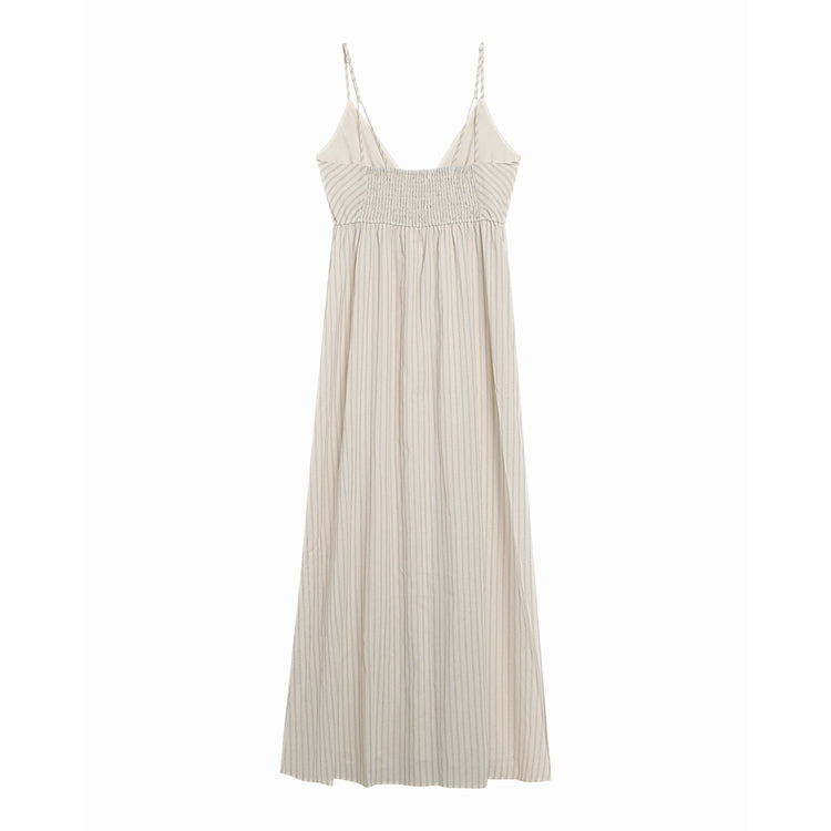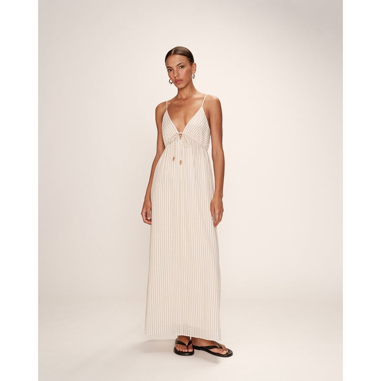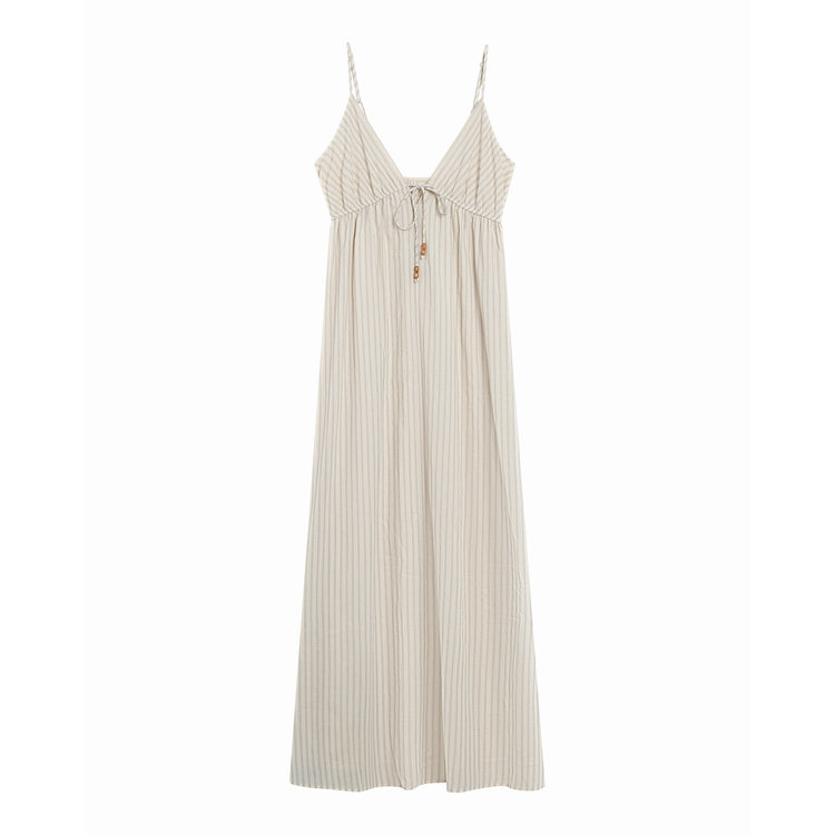 RAJA ist ein langes, gestreiftes Kleid ohne Ärmel, mit tiefem V-Ausschnitt und einem Bindeband unter der Brust.