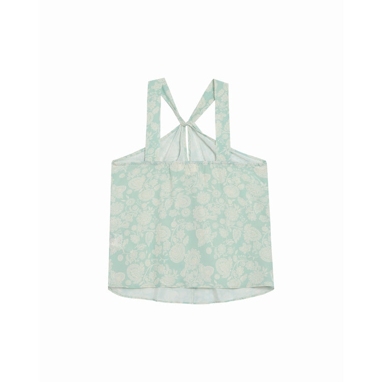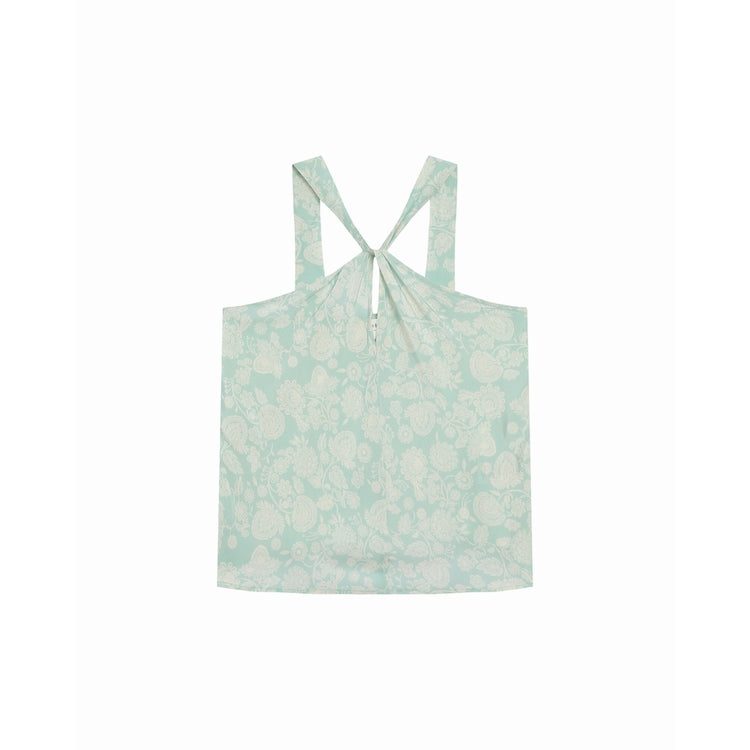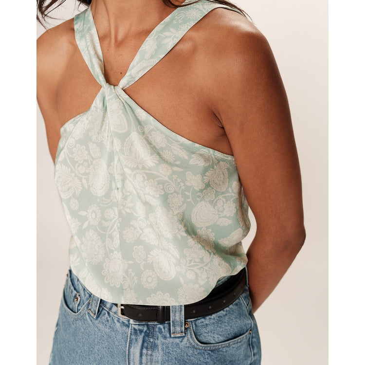 RACINE ist ein ärmelloses Top mit Paisley-Print und einem amerikanischen Ausschnitt mit gedrehtem Detail auf der Vorderseite.